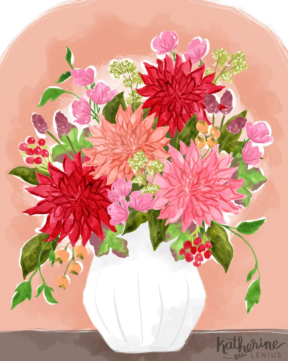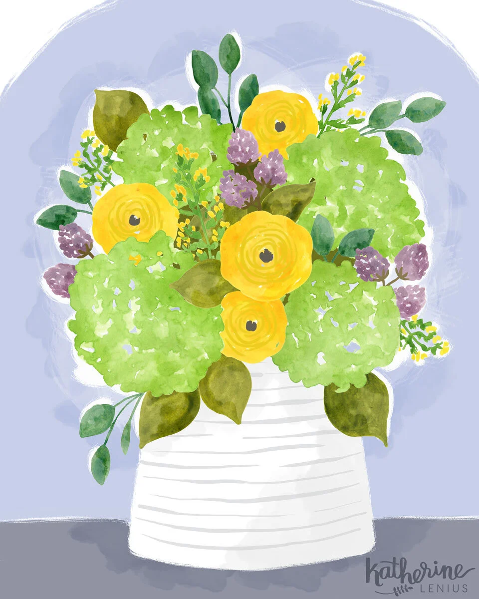 I was having a hard time getting into my groove on Monday so I went back to some flowers I'd painted the week before and started "arranging" them in Photoshop. I actually love arranging flowers in real life (I get that from my Grandma Virginia) and it turns out arranging them digitally is almost as much fun - and they last FOREVER!
