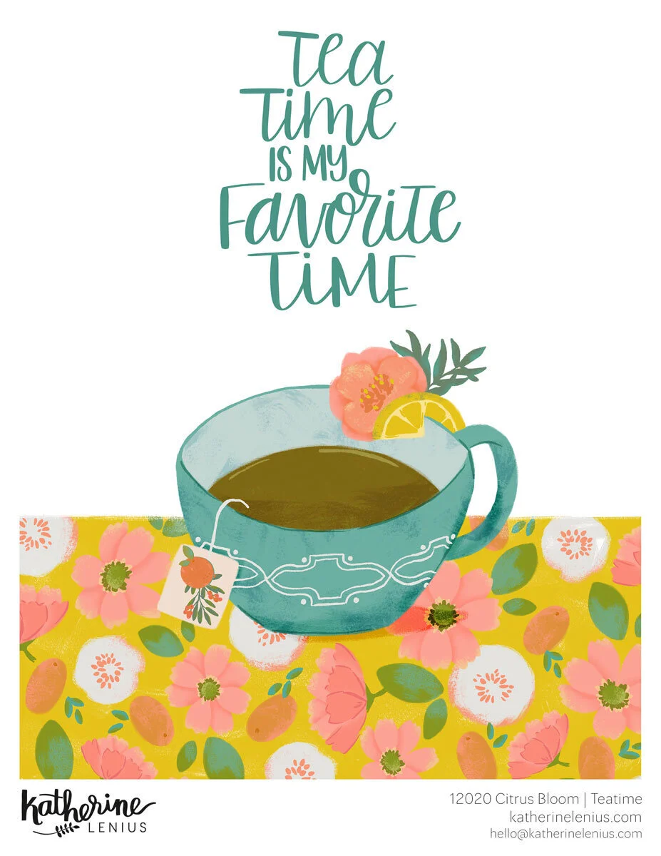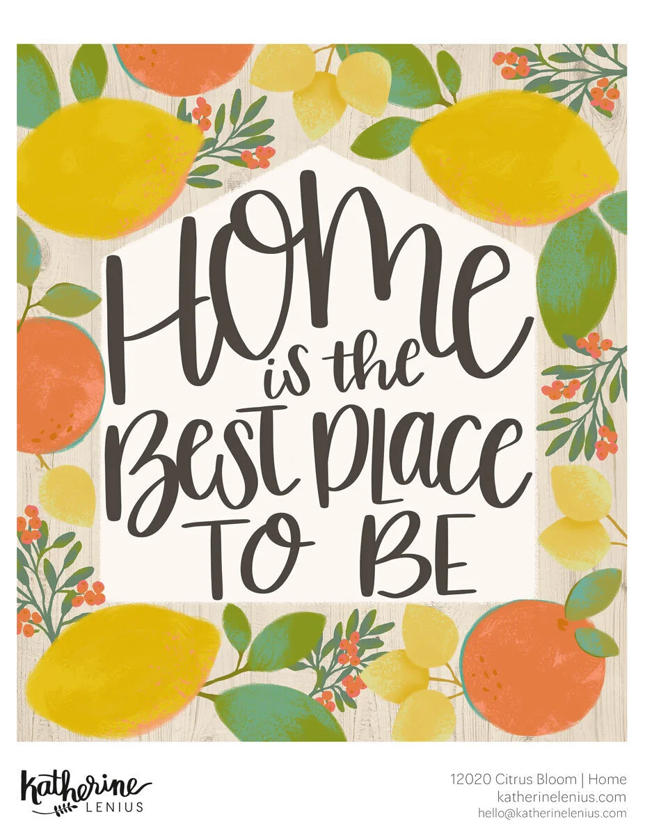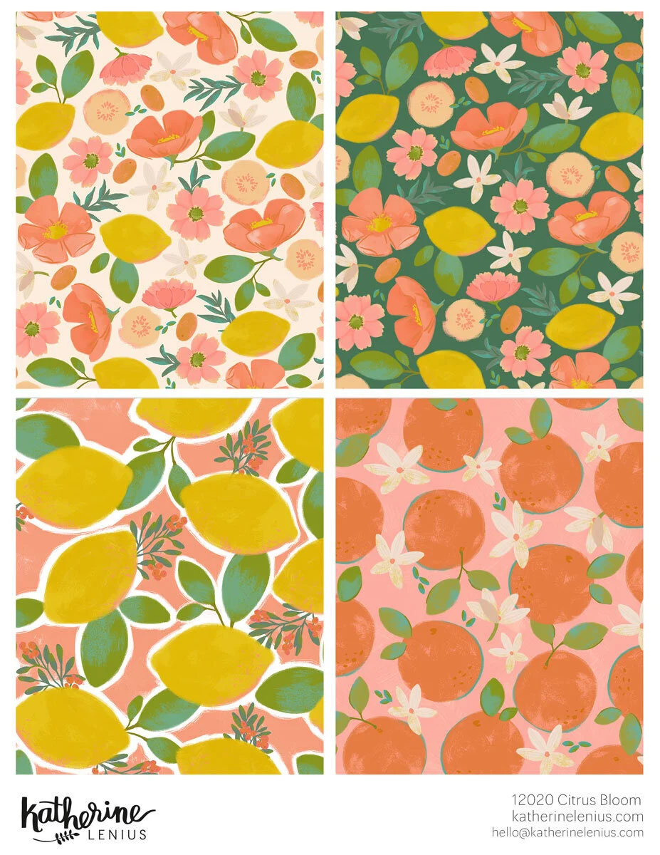 Anyone who knows me knows that I’m a true homebody. I love to be at home, to decorate a home, and to take care of a home (although my housekeeping lacks a certain level of enthusiasm). And I find that surrounding my home with things that have meaning to me or that I really enjoy makes my home “fit” me. Which is why I’ve been looking to expand my work into markets like home decor and tabletop. It requires me to think about design and art in a slightly different way but I’m looking forward to creating more art for the home and coming up with product concepts. Here’s a peek at a recent collection I call Citrus Bloom. While warm summer days have just left the building around these parts, these designs make me look forward to next summer.